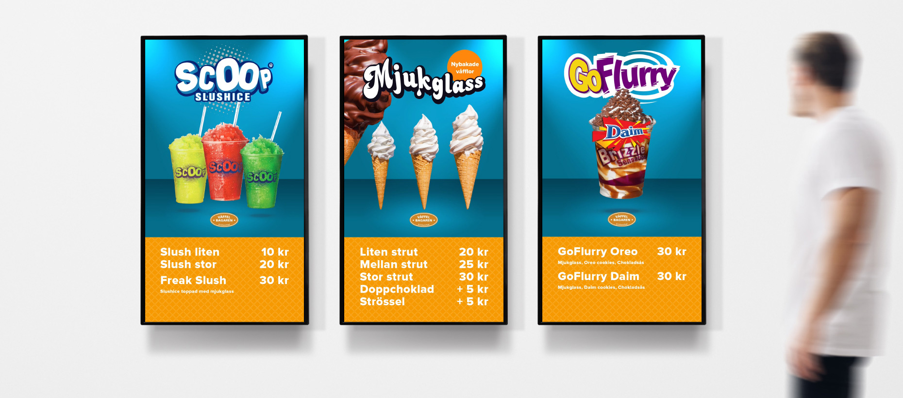 Våffelbagaren är den ledande tillverkaren av våffelstrutar i Skandinavien. Tillsammans arbetar vi fram allt från koncept, digitala menyskyltar och bilder till färdig förpackningsdesign.